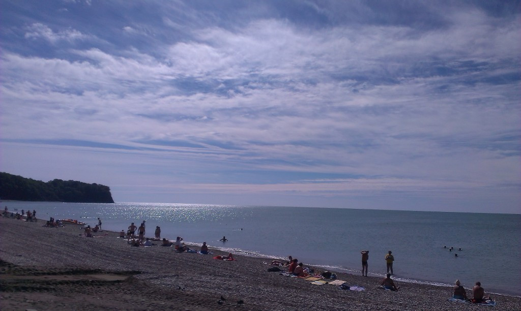 Пляж: около 2 минут ходьбы, бесплатный поселковый со средней и крупной галькой, есть песчано-галечные участки пляжа. На пляже – лежаки, навесы (примерно 250 р. в сутки, 150 р. пол дня за лежак), водные виды спорта, аттракционы, кафе, рестораны, wi-fi.